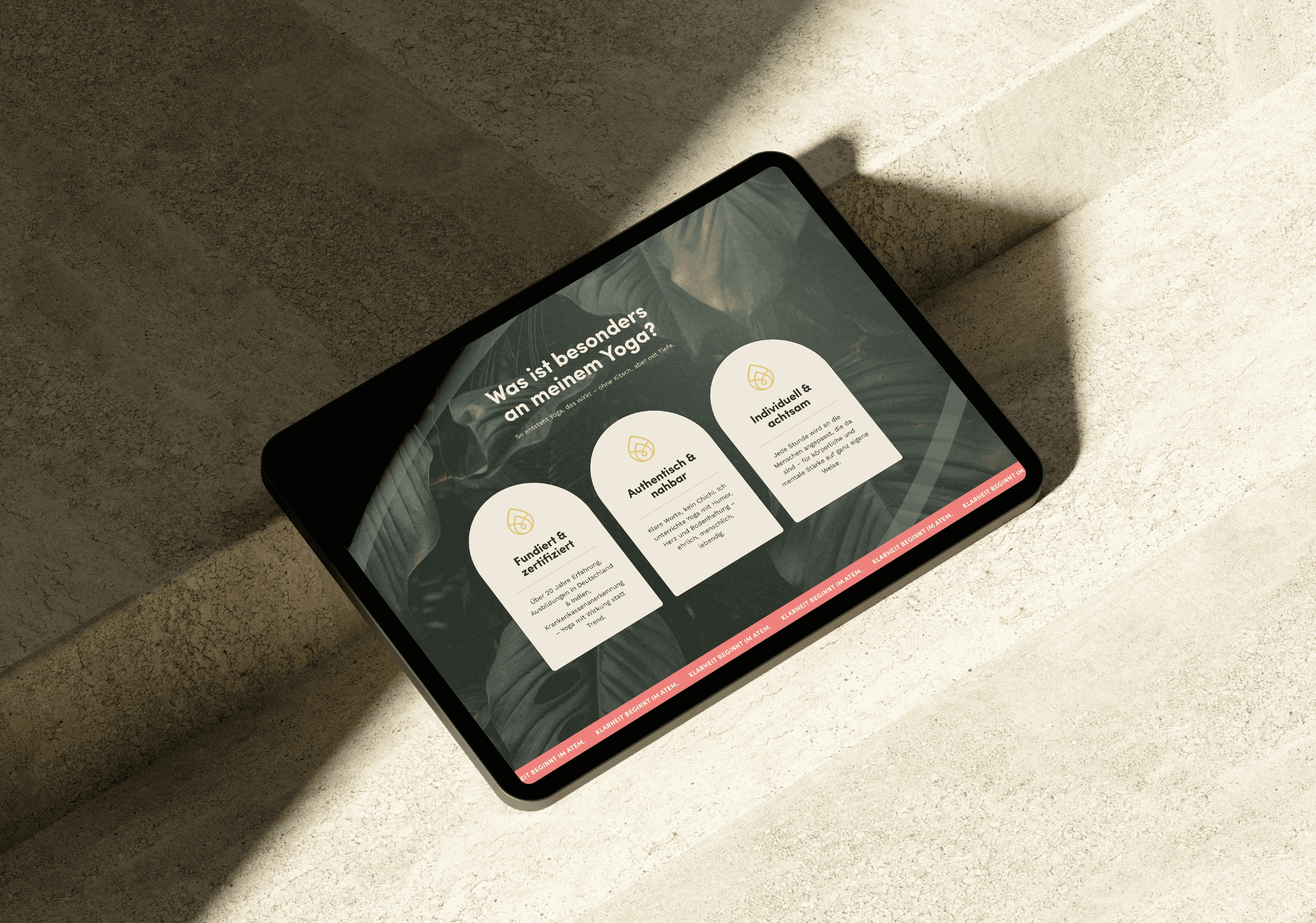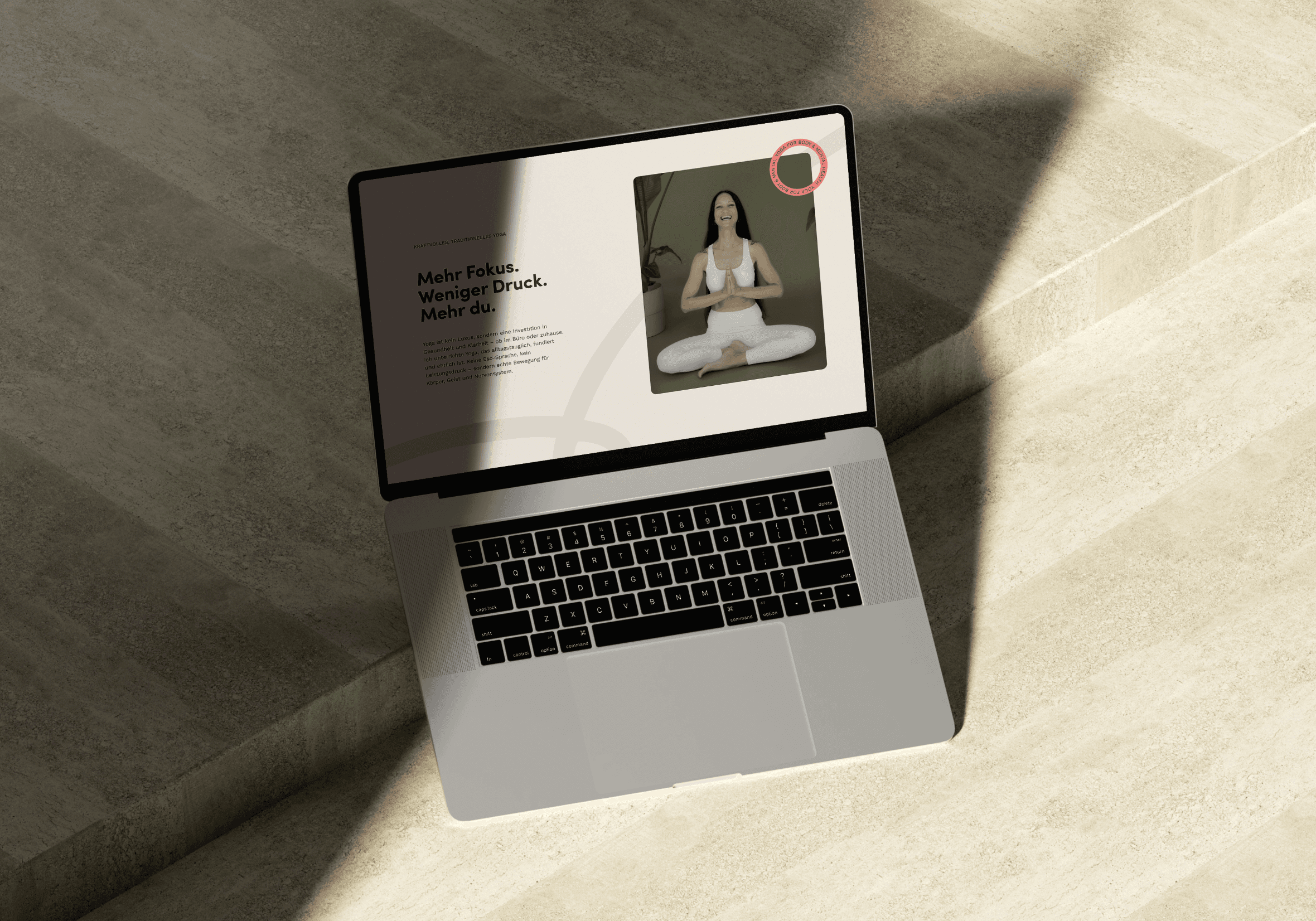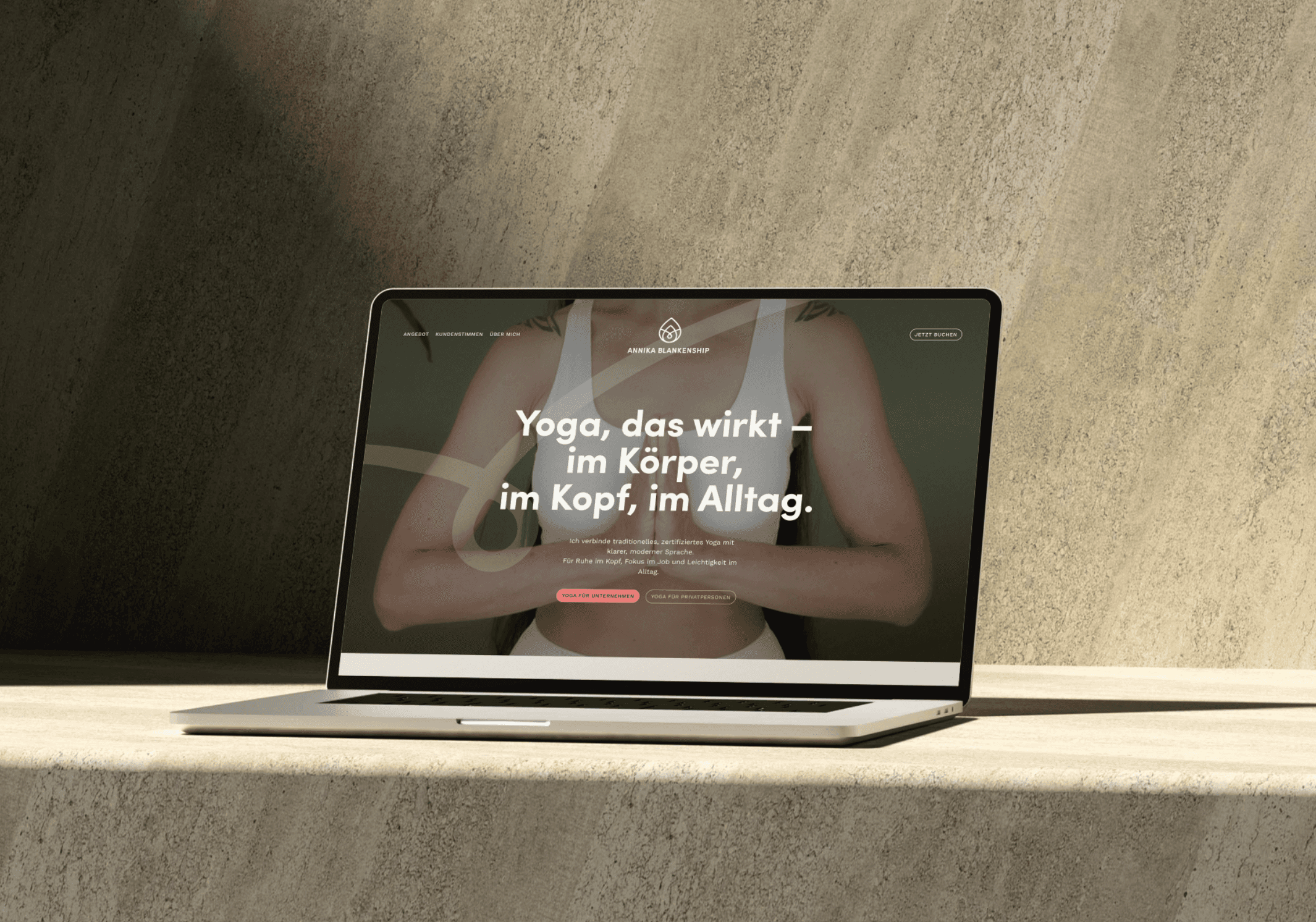 Weg von allem, was Yoga-Klischee ist. Kein weiches Licht, keine Lotus-Symbolik, keine spirituellen Versprechen. Stattdessen eine Bildsprache und Sprache, die Unternehmen wirklich anspricht. Der Moment, der alles veränderte: als Annika ihre Vision zum ersten Mal schwarz auf weiß sah und plötzlich wusste, wohin es geht.