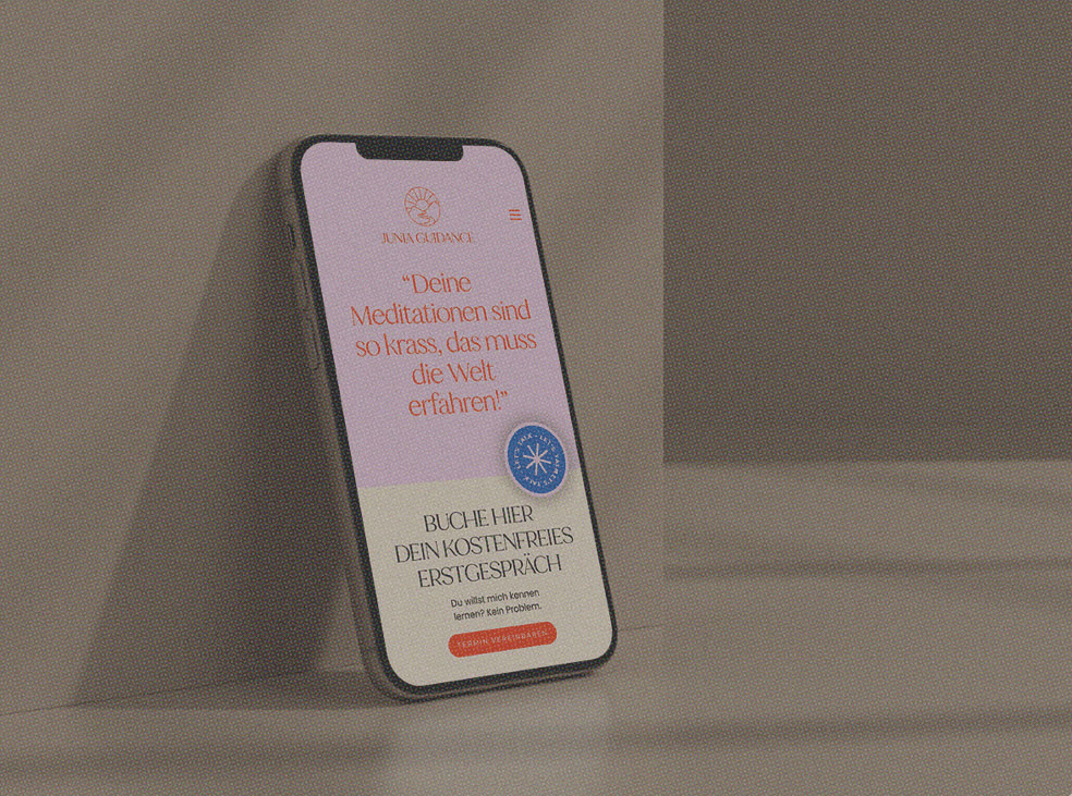 Ein Tag. Branding und Website, fertig. Das klingt nach Abkürzung. Ist es nicht. Es setzt voraus, dass die Kundin wirklich vorbereitet ist: Texte, Bilder, Pinterest-Board, eine klare Richtung. Junia hatte das alles. Wir haben früh morgens angefangen und waren am späten Nachmittag fertig. „Innen und außen sind eins“ war von Beginn an klar. Was es brauchte, war eine Marke, die Spiritualität hell, modern und ohne Esoterik-Klischee zeigt. Das ist gelungen.